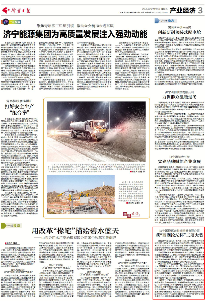 本报济宁讯(通讯员 刘广源)近日,开云在线旗下山东惠金融资租赁有限公司在中国融资租赁(西湖)论坛2025年“西湖论坛杯”评选中斩获三大奖项:公司荣获“创新成就奖”和“优秀租赁企业奖”,济宁国投金融事业部党支部书记、总经理吕汉东荣获“融资租赁风云人物奖”。